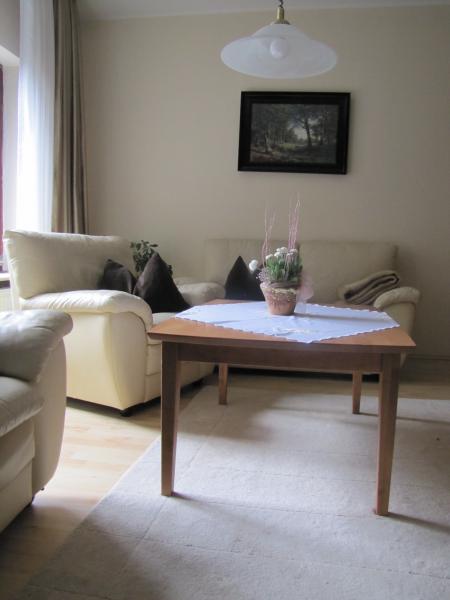 Das gemütliche Wohnzimmer mit Ledersofa, Sesseln und der alte Eichenschrank vermitteln Ihnen eine wohnliche Wärme. Ein TV Gerät gehört natürlich ebenso zur Ausstattung.